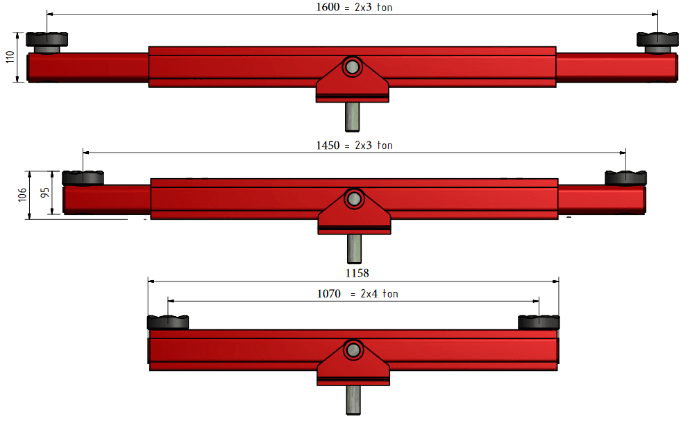 Utdragsarmarna dras ut för hand och når lyftpunkter 1070-1600 mm i cc-mått.